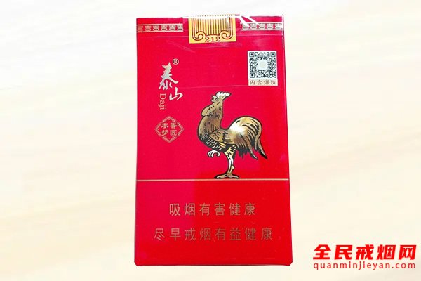 泰山(大鸡爆珠版)为软盒硬化短支香烟,外包装色调为红色搭配些许的金色,看上去十分有档次,烟嘴长,烟气大,有着轻微的薄荷味,口感很不错,非常适合老烟民。